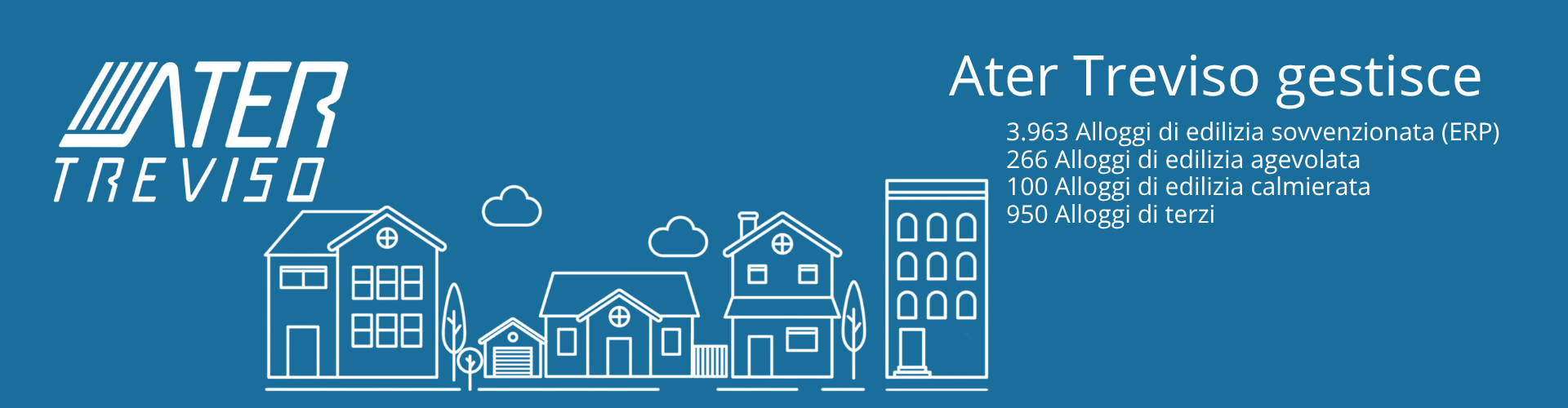 Uffici e contatti Informazioni per i pagamenti Bandi ERP Bandi di mobilità ERP Bandi alloggi canone agevolato/concordato ed unità ad uso commerciale Aste Avvisi e Novità Pubblicato AVVISO D'ASTA PUBBLICA VINCOLATA Pubblicata proroga termini bandi per le forze dell'ordine al 13 febbraio 2026 PRESENTAZIONE ISEE 2026 Pubblicate graduatorie definitive per l'assegnazione di alloggi ERP: ARCADE CAMBIO IBAN ATER TREVISO Novità relative al servizio di Bonifico SEPA Avviso di mobilità per la copertura di un posto di 6° livello - IMPIEGATO TECNICO - SCADENZA 31/01/2026 Avviso di selezione per la copertura di un posto di 6° livello - SCADENZA 31/01/2026 Modifica contatti e-mail - Accedi all'elenco completo Servizi online di Ater Treviso Accedi ai servizi onlinedi Ater Treviso Accedi Richiedi maggiori informazionisulla nuova APP "Housing Plus"chiamando i nostri uffici al numero 0422 296411